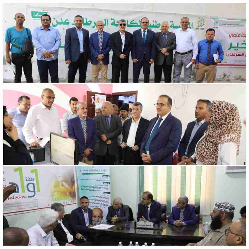 تفقد وزير الصحة العامة والسكان الدكتور قاسم محمد بحيبح بالعاصمة عدن اليوم سير العمل في المؤسسة الوطنية لمكافحة السرطان بمديرية صيرة الوزير وبمعية وكيل وزارة الصحة لقطاع السكان الدكتور سالم الشبحي ومدير عام مكتب الصحة والسكان بعدن الدكتور احمد البيشي التقوا قيادة المؤسسة واطلعوا من الامين العام للمؤسسة ابوبكر للعبيد والمدير العام التنفيذي للمؤسسة ابراهيم بن بامفروش على التدخلات الصحية لها في مجال مكافحة السرطان من خلال العيادات والأقسام المختلفة التابعة لها منها مركز الحياة للكشف المبكر عن السرطان والذي يضم عدد من التجهيزات الطبية الموجهه لمرضى السرطان كاجهزة الكشف عن سرطان الثدي وعنق الرحم وجهاز خاص بالبهاق والبرص والصديقة والصيدلة وقسم التوعية والدعم النفسي ، بالإضافة إلى انشطة العيادات الوردية في التجمعات السكانية ومخيمات النازحين.