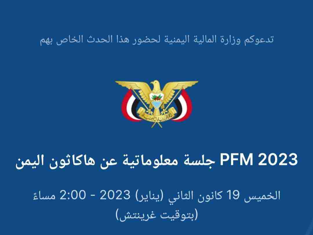 دعت وزارة المالية، كافة المواهب والمبتكرين المحليين والدوليين في مجال تكنولوجيا المعلومات إلى المشاركة في فعالية هاكاثون إدارة المالية العامة في اليمن 2023م، المقرر انطلاقها مساء يوم غد الخميس، والهادفة لتحسين إدارة شؤون المالية العامة باستخدام التقنيات الرقمية، وذلك بتمويل من صندوق النقد الدولي وبيل وميليندا غيتس.