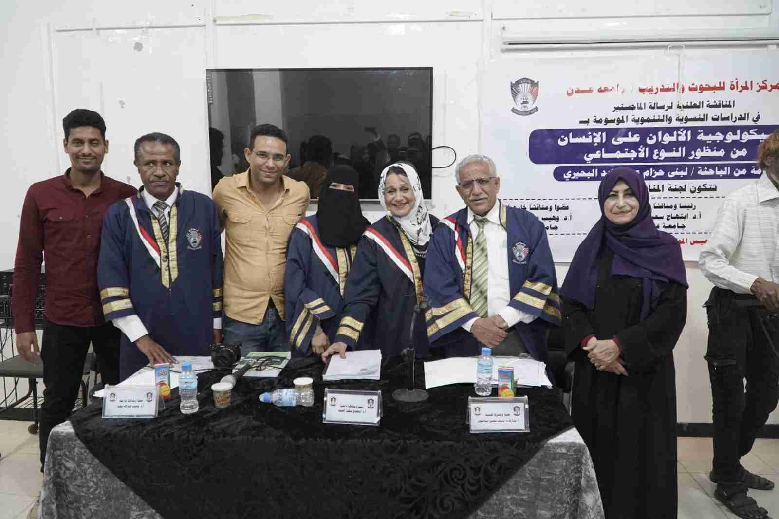 عقد صباح يوم الخميس بمركز المرأة بجامعة عدن المناقشة العلنية لرسالة الماجستير الموسومه ب سيكولوجية الألوان على الإنسان من منظور النوع الاجتماعي للباحثة لبنى البحيري.