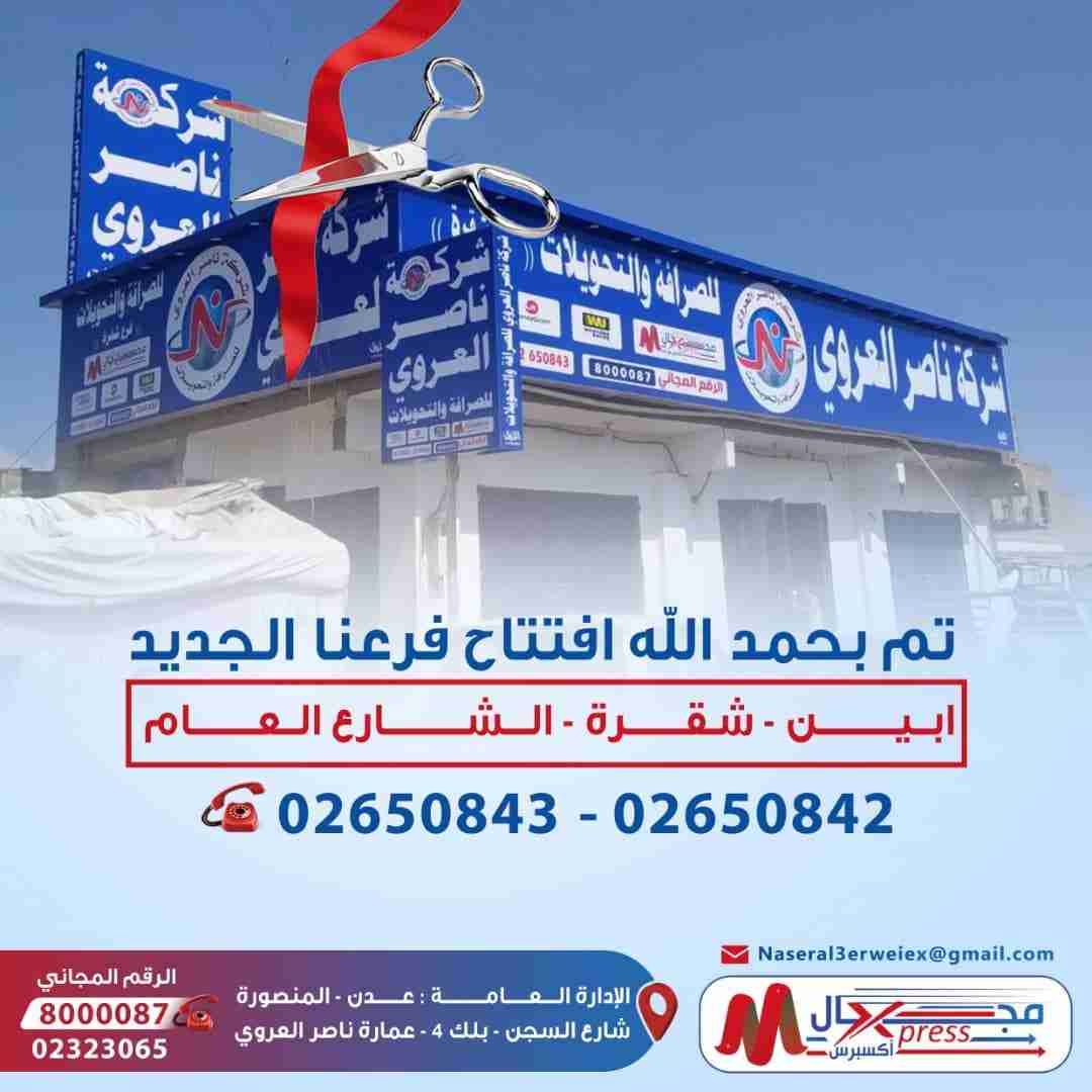 افتتحت شركة ناصر العروي للصرافة والتحويلات المالية، اليوم، فرعها الجديد في الشارع العام بمدينة شقرة محافظة أبين.