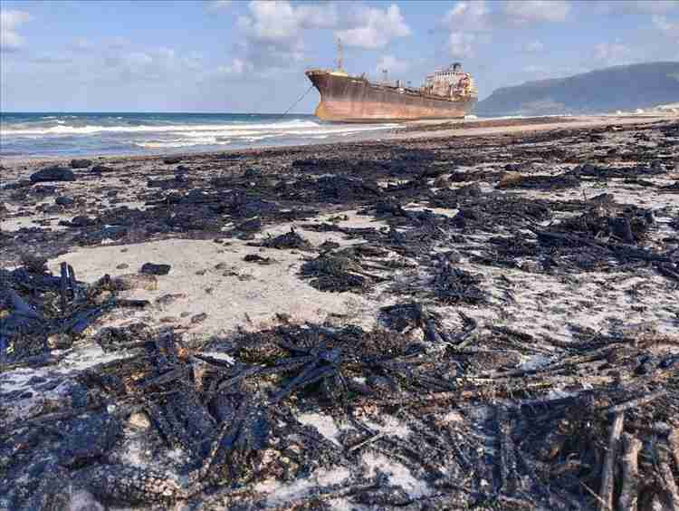 وأظهرت الصور تسرب كميات نفطية سوداء تغطي مساحات واسعة من الساحل، خلفت مادة مخاطية سوداء اللون شبيهة بالإسفلت.