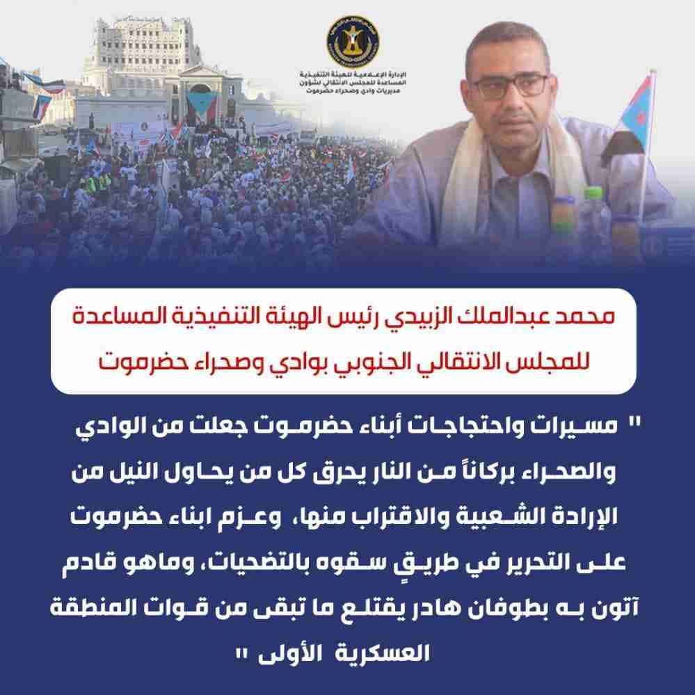 قال رئيس الهيئة التنفيذية المساعدة للمجلس الانتقالي الجنوبي لشؤون مديريات وادي وصحراء حضرموت الأستاذ/ محمد عبد الملك الزبيدي: "أن مسيرات واحتجاجات أبناء حضرموت جعلت من الوادي والصحراء بركاناً من النار يحرق كل من يحاول النيل من الإرادة الشعبية والاقتراب منها".