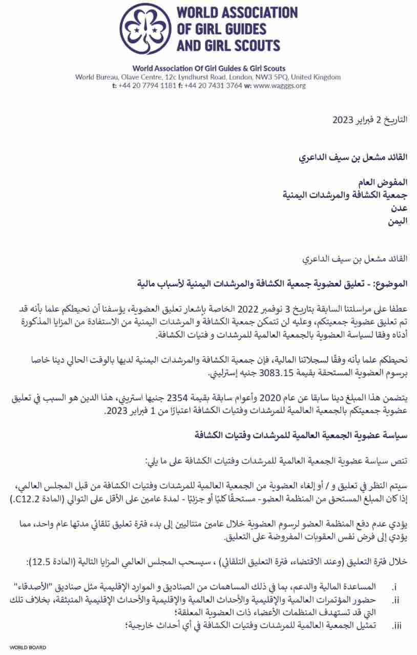 أقدمت الجمعية العالمية للمرشدات وفتيات الكشافة على تعليق عضوية مرشدات اليمن، بسبب عدم سداد الرسوم خلال السنوات السابقة بمبلغ 3 الف جنية إسترليني فقط.