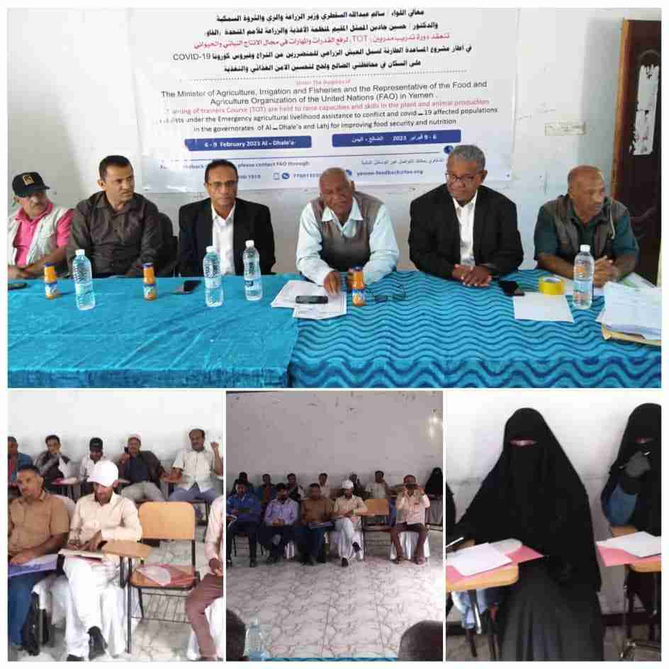 بدأت صباح اليوم بمحافظه الضالع الدورة التدريبيه لتدريب مدربين برعاية كريمة من معالي وزير الزراعه والري والثروة السمكيه اللواء سالم عبدالله السقطري والممثل المقيم لمنظمة الاغذيه واازراعه للامم المتحدة الدكتور حسين جادين في اطار مشروع المساعدة الطارئة لسبل العيش الزراعي للمتضررين من النزاع وفيروس كورنا Covid 19 على السكان في محافظتي الضالع ولحج لتحسين الامن الغذائي والتغذيه وبتمويل من مركز الملك سلمان للاغاثه والاعمال الانسانيه وتنفذه منظمة الاغذيه واازراعه الفاو