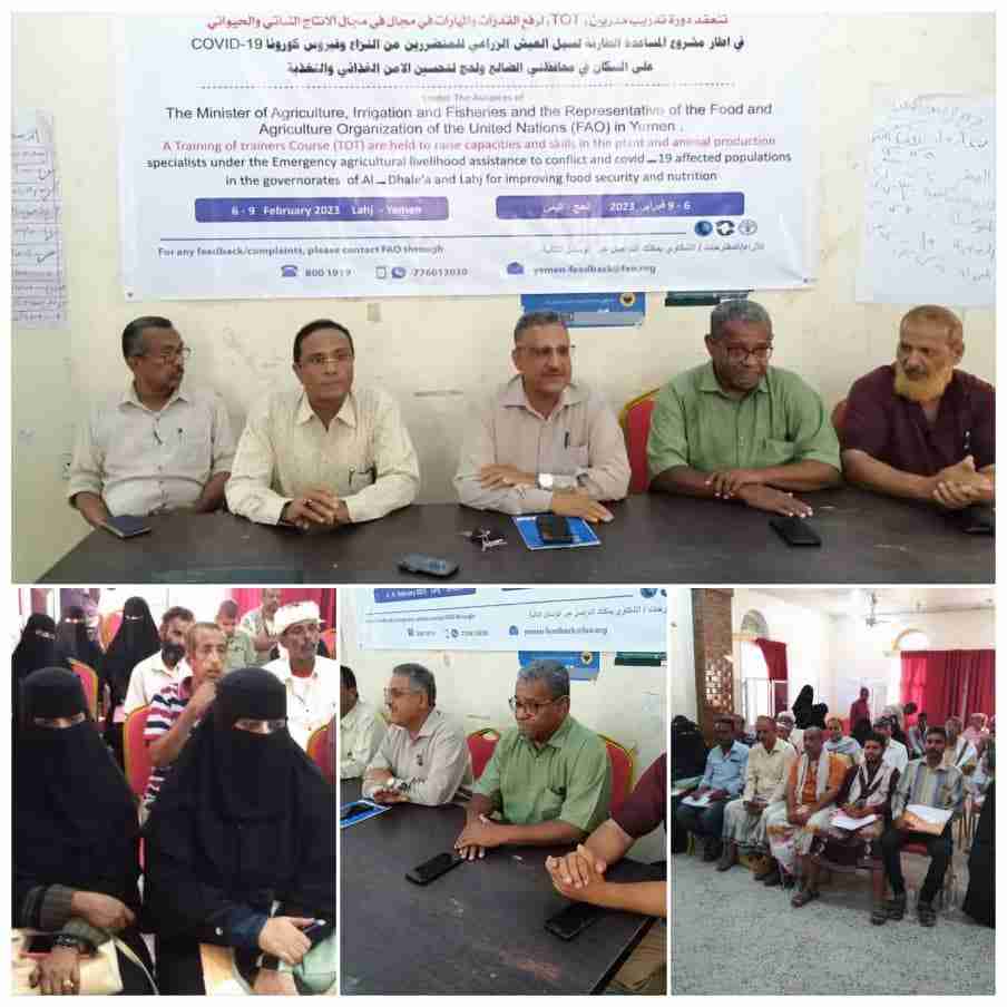اختتمت اليوم بمحافظتي لحج والضالع الدورة تدريب مدربينToT واللي دشنت برعاية معالي وزير الزراعه والري والثروة السمكيه اللواء سالم عبدالله السقطري والممثل المقيم لمنظمة الاغذيه واازراعه للامم المتحدة الدكتور حسين جادين واللي نظمتها الادارة العامه للارشاد والتدريب الزراعي وتنفيذ منظمة الفاو وبتمويل من مركز الملك سلمان للاغاثه والاعمال الانسانيه في اطار مشروع المساعدة الطارئة لسبل العيش الزراعي للمتضررين من النزاع وفيروس كورنا Covied 19 على سكان محافظتي لحج والضالع لتحسين الامن الغذائي والتغذيه