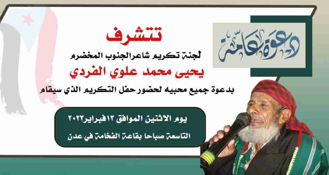 تشهد قاعة الفخامة بعدن صباح غد الاثنين حفل تكريم شاعر الجنوب المخضرم يحيى محمد علوي الفردي، بعد مسيرة نصف قرن من الإبداع والنضال والثبات في المواقف الوطنية التي لم يحد عنها الشاعر قيد أنملة، وما زال صوته مدوياً من أجل انتصار قضية شعبنا الجنوبي واستعادة هويته ودولته كامل السيادة بحدود 1990م، ويصح القول فيه أنه لسان حال مجتمعه وشاعر الشعب الملتزم وصوته المدوي، في كل المراحل والمنعطفات.