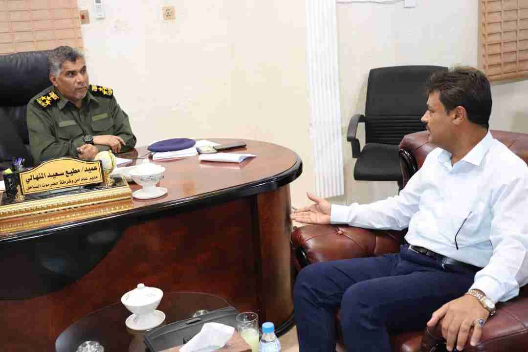 ناقش المدير العام لأمن وشرطة ساحل حضرموت، العميد مطيع سعيد المنهالي، اليوم الثلاثاء بالمكلا، مع المدير العام لهيئة المساحة الجيولوجية بحضرموت، المهندس فائز أحمد باصرة، الصعوبات والتحديات التي تعترض عمل الهيئة المختصة بالجانب الأمني .