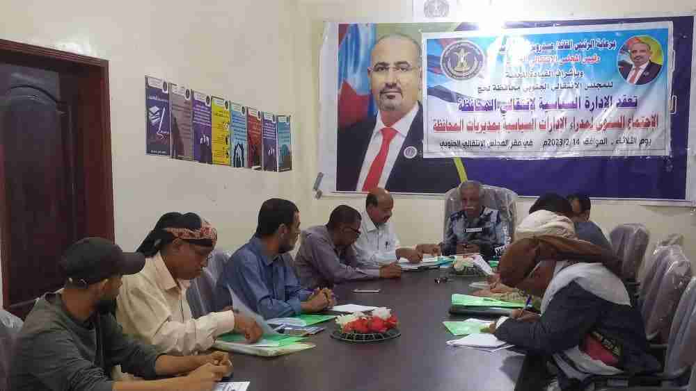 عقدت الادارة السياسية بالقيادة المحلية للمجلس الانتقالي الجنوبي في محافظة لحج اليوم الثلاثاء اجتماعها السنوي لمدراء الادارات السياسية بمديريات المحافظة في مقر المجلس بمدينة الحوطة .
