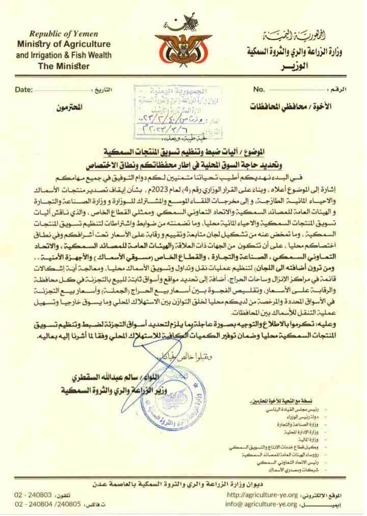 أصدرت وزارة الزراعة والري والثروة السمكية مذكرة رسمية إلى محافظي المحافظات أشارت فيها إلى تحديد أسواق ثابتة لبيع الأسماك بالتجزئة في كل محافظة وذلك لضبط وتنظيم تسويق المنتجات السمكية محلياً وضمان توفير الكميات الكافية للاستهلاك المحلي.