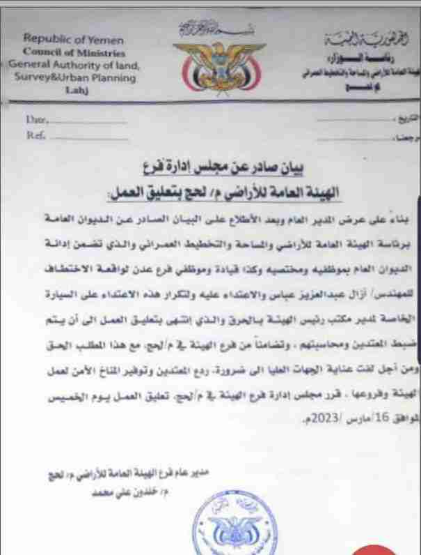 بيان صادر عن مجلس إدارة فرع الهيئة العامة للأراضي في محافظة لحج بتعليق العمل