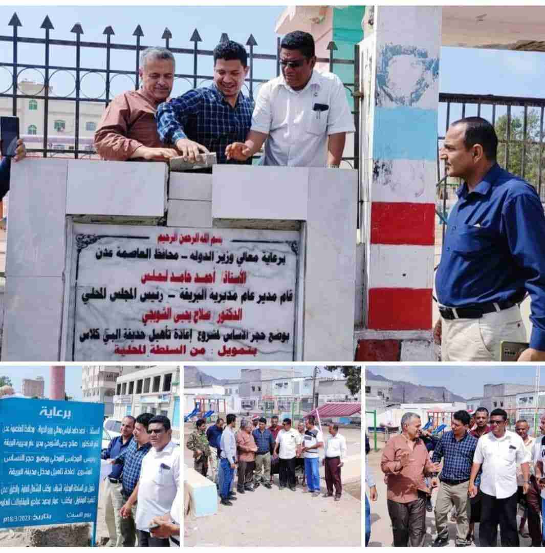 ووضع مدير عام مديرية البريقة، ومدير مكتب الأشغال بعدن، حجر الأساس لمشروع ( إعادة تأهيل حديقة بي كلاس - المتقاعدين ) بتكلفة إجمالية "154" مليون و "232" ألفًا و "488" ريالًا، والذي ستنفذه ( صحاري جلوبال للهندسة والمقاولات )، وكذا مشروع ( إعادة تأهيل مدخل مديرية البريقة ) بكلفة بلغت "43" مليون و "145" ألفًا و "979" ريالًا، سينفذه ( مكتب عمار محمد عبادي )، وبإشراف مكتب الأشغال العامة بالعاصمة عدن.