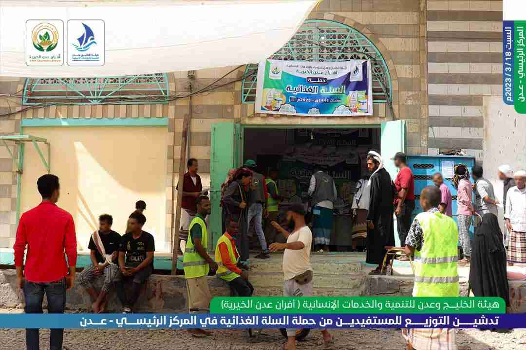 دشنت هيئة الخليج وعدن للتنمية والخدمات الإنسانية (أفران عدن الخيرية) توزيع السلة الغذائية على الأسر المتعففة في العاصمة عدن وذلك في إطار حملة المساعدات الإنسانية بالشهر الفضيل.