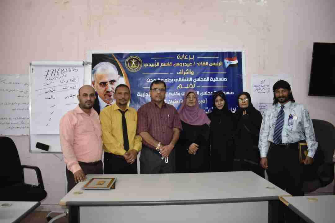أختتمت منسقية المجلس الانتقالي الجنوبي بكلية العلوم الادارية ظهر اليوم الاثنين الدورة التدريبية الذي نظمتها منسقية الكلية على مدى يومين حول "إدارة الذات والتحفيز الايجابي" لعدد من اعضاء الهيئة التدريسية والتدريسية المساعده والموظفين والموظفات.
