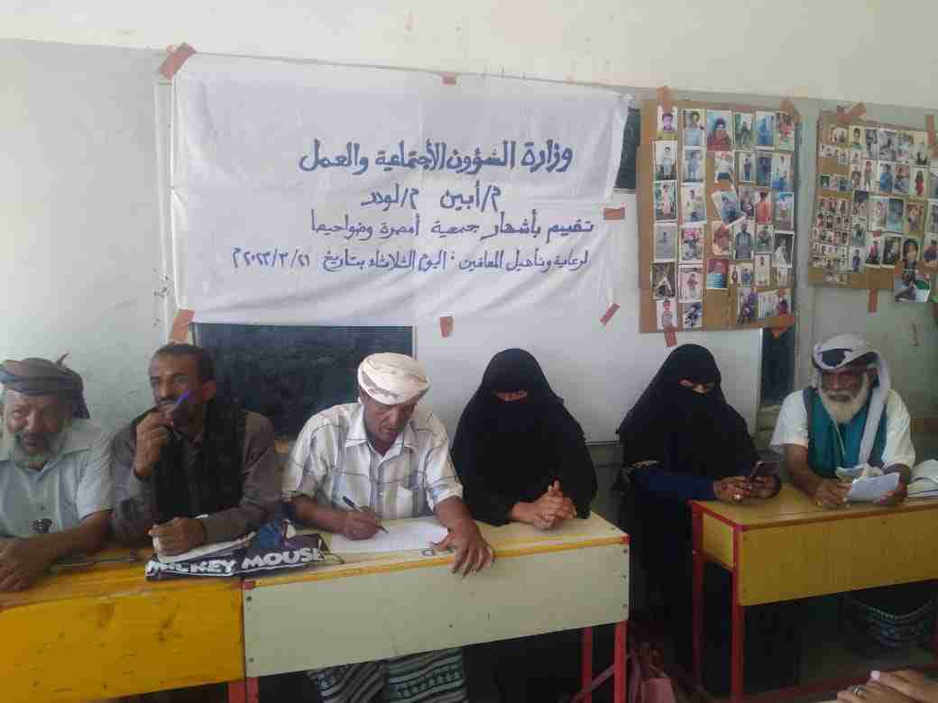 وسط أجواء ممتلئه بالود والاخاء والوفاء للمعاقين ،دشن صباح يوم الثلاثاء الموافق 2023/3/21 بمديرية لودر منطقة امصرة النخعيين اشهار جمعية المعاقين, ذالك بحضور الأخت مديرة إدارة الشؤون الاجتماعية والعمل بالمجلس الانتقالي الجنوبي محافظة أبين جيهان حيدره والاخ جمال موسى مدير الشؤون الاجتماعية والعمل بالسلطه المحليه بالمديرية لودر.