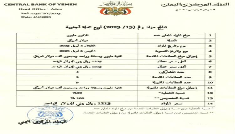 أعلن البنك المركزي اليمني اليوم الثلاثاء الموافق 4 أبريل 2023م، عن نتائج المزاد رقم (15-2023) لبيع عملة أجنبية، والتي صدر اعلان عنها يوم الخميس الماضي.