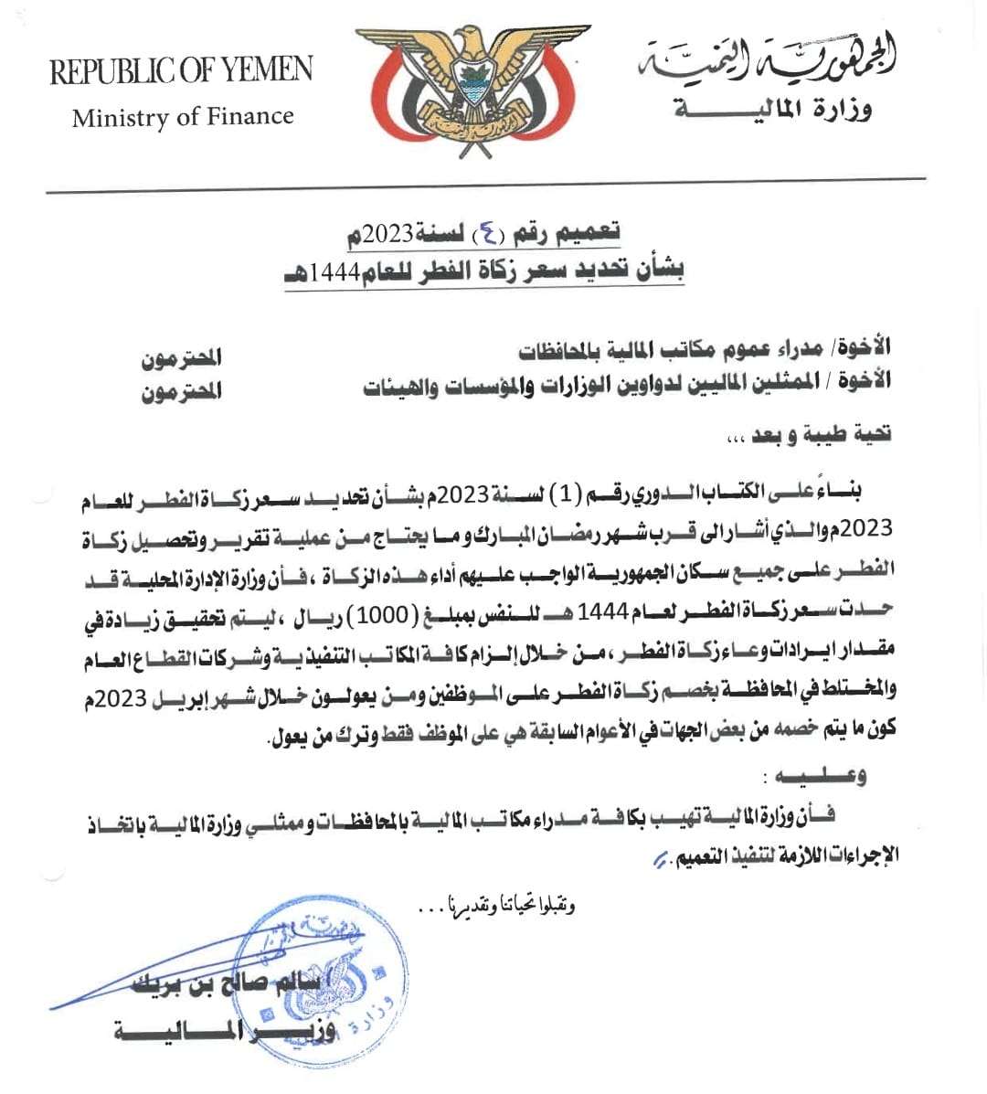 أصدر معالي وزير المالية سالم صالح بن بريك تعميما رقم ( ٤ ) لسنة 2023م بشأن تحديد سعر زكاة الفطر للعام 1444هـ.