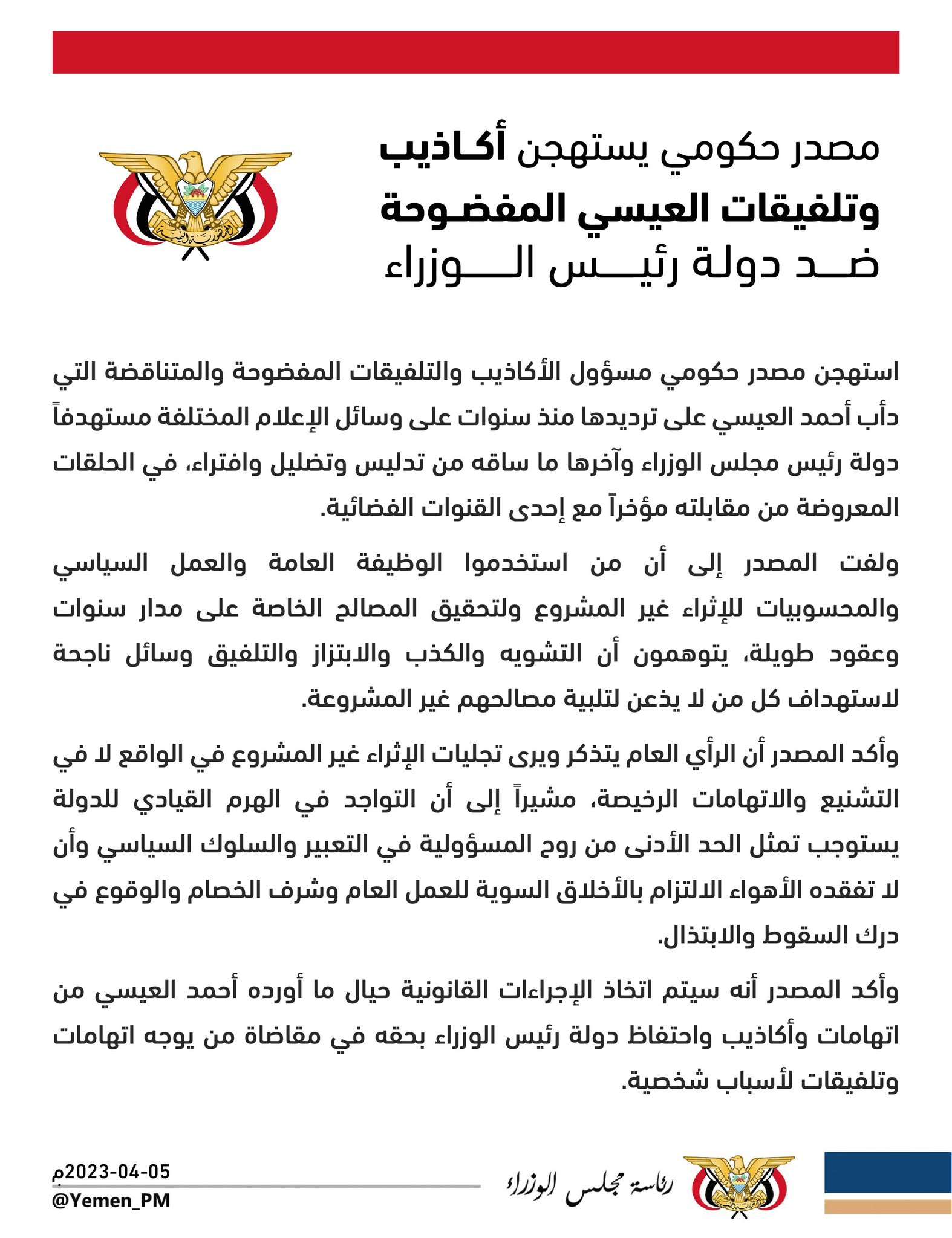 استهجن مصدر حكومي مسؤول الأكاذيب والتلفيقات المفضوحة والمتناقضة التي دأب أحمد العيسي على ترديدها منذ سنوات على وسائل الإعلام المختلفة مستهدفاً دولة رئيس مجلس الوزراء وآخرها ما ساقه من تدليس وتضليل وافتراء، في الحلقات المعروضة من مقابلته مؤخراً مع إحدى القنوات الفضائية.