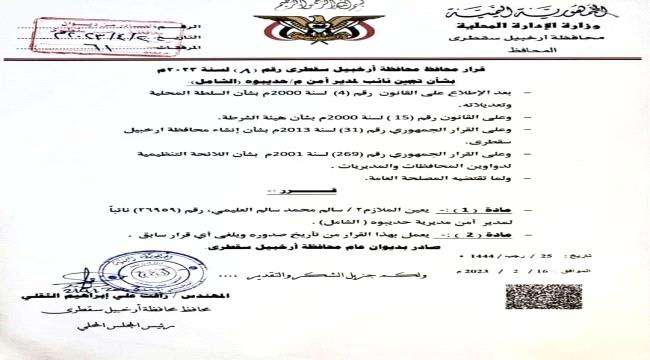 أصدر محافظ محافظة أرخبيل سقطرى - رئيس المجلس المحلي المهندس/رأفت علي إبراهيم الثقلي ، القرار رقم (8) لسنة 2023م ،القاضي بتعيين نائب لمدير أمن حديبوه (الشامل).