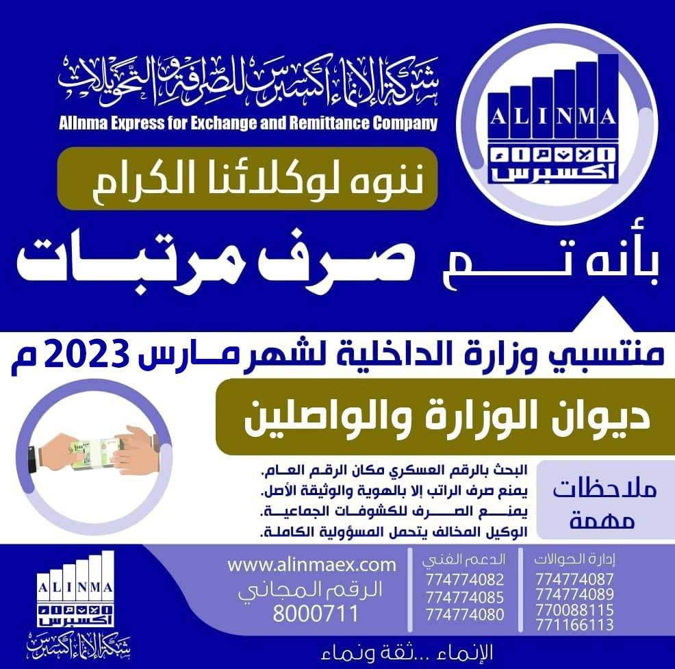وبدات اليوم الاحد صرف مرتبات شهر مارس ل ديوان الوزارة والواصلين عبر شركة الانماء للصرافة .