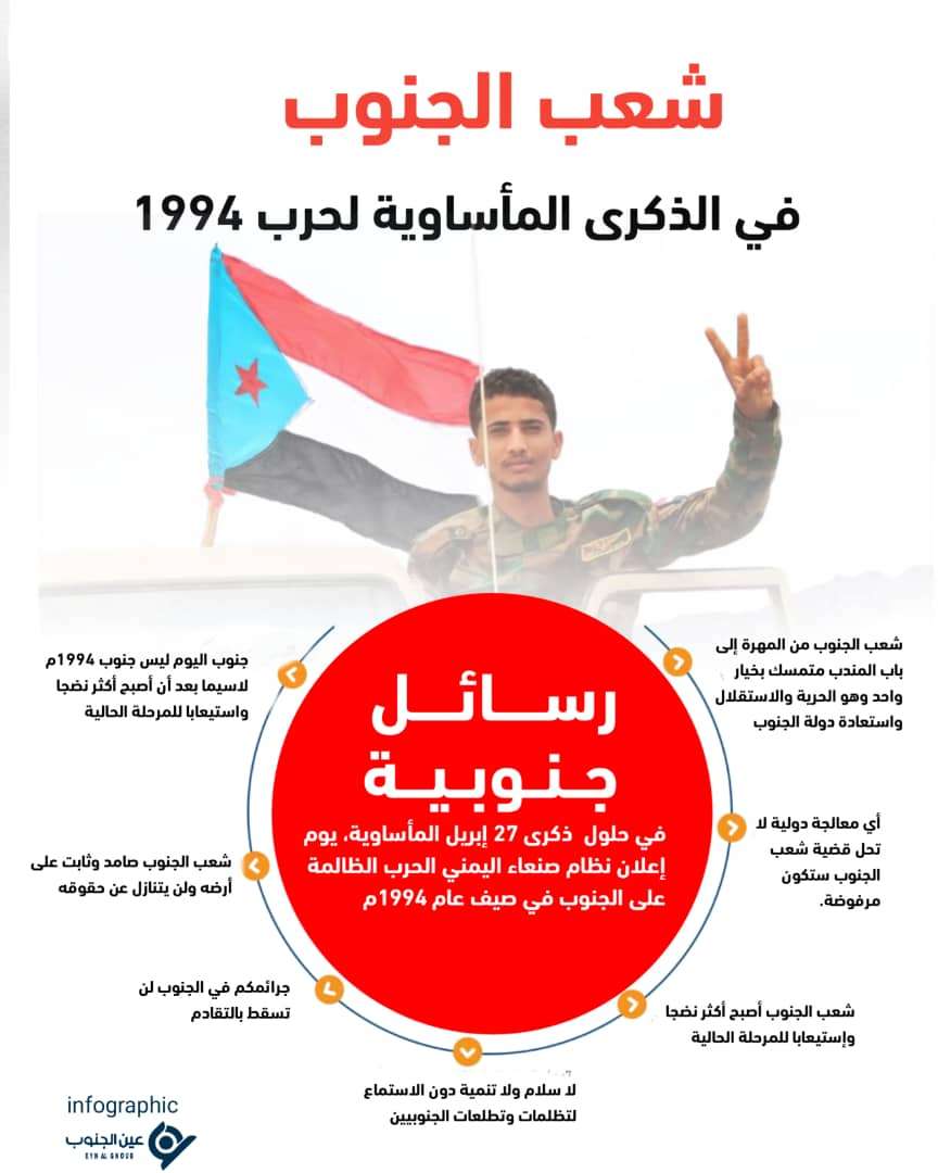 وتحل اليوم الخميس 27 إبريل / نيسان 2023م الذكرى التاسعة والعشرون لحرب نظام صنعاء الظالمة ضد الجنوب في ابريل صيف 1994م.