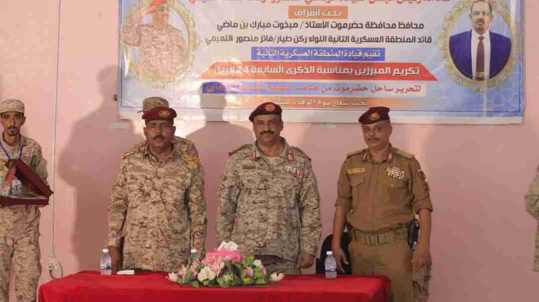 كرمت قيادة المنطقة العسكرية الثانية القادة العسكريين والمبرزين من الوحدات والالوية والشعب صباح اليوم الاحد بمقر قيادة المنطقة وذلك بمناسبة الذكرى السابعة لتحرير ساحل حضرموت الرابع والعشرون من أبريل.