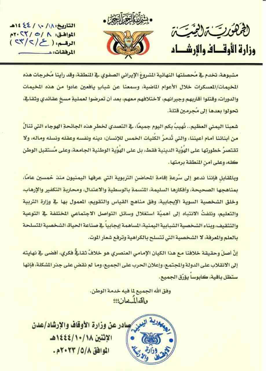 أطلقت وزارة الأوقاف والإرشاد، اليوم، بالعاصمة المؤقتة عدن، نداءً عاجلًا للمجتمع اليمني بشأن مخاطر المعسكرات الصيفية الحوثية التي تدشنها المليشيات الحوثية المدعومة إيرانيًا في عموم المحافظات الواقعة بالإكراه تحت سيطرتها كما أصدرت الوزارة تعميمًا هامًا للخطباء والدعاة والمرشدين للقيام بدورهم في كشف المخطط الصفوي الفارسي الذي تنفذه الأداة الحوثية الإرهابية في اليمن.