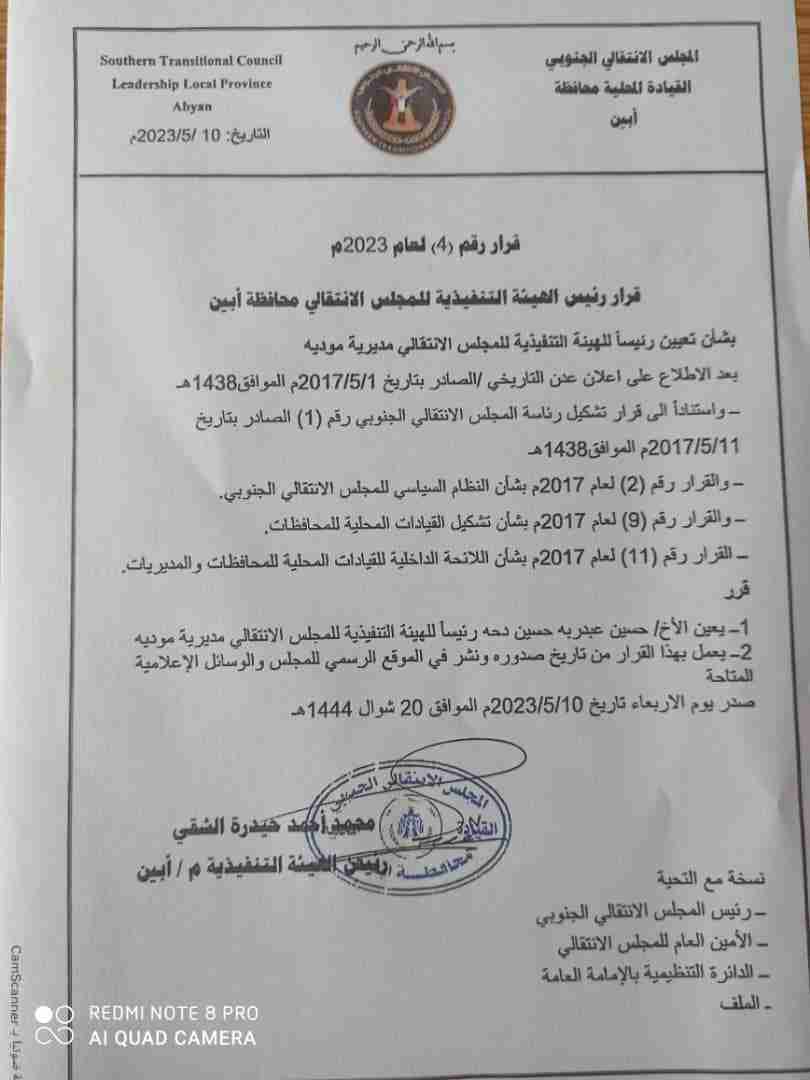 أصدر رئيس الهيئة التنفيذية للمجلس الانتقالي بمحافظة أبين الأستاذ محمد أحمد الشقي قرارا بتعيين رئيساً للهيئة التتفيذية بمديرية مودية