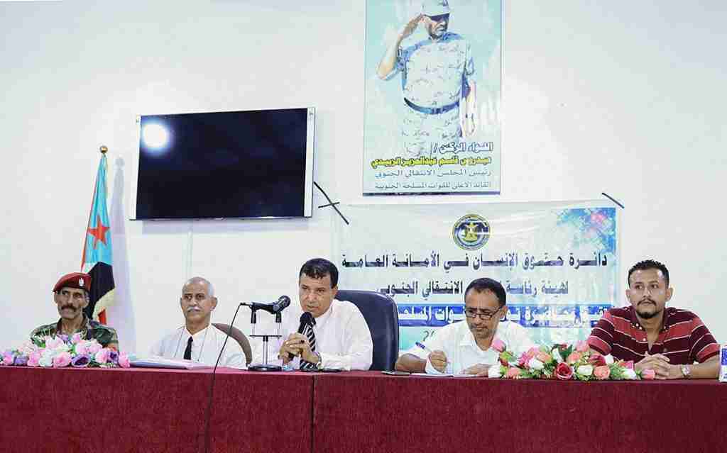 نظمت الدائرة القانونية والحقوقية في الأمانة العامة لهيئة رئاسة المجلس الانتقالي الجنوبي، اليوم الاثنين، محاضرة توعوية لأفراد اللواء الاول مشاة، في مجال القانون الدولي والإنساني والقانون الدولي لحقوق الإنسان ومبادئ التعامل مع المواطنين.