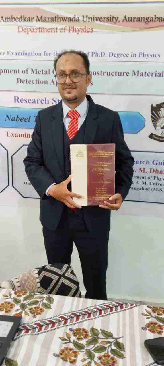منح قسم الفيزياء بجامعة الدكتور بابا صاحب امبيدكار مارثوادا - جمهورية الهند صباح أمس الخميس 18 مايو 2023م درجة الدكتوراه في الفيزياء للباحث نبيل ثابت عبود الدهشلي عضو الهيئة التدريسية المساعدة بكلية التربية يافع، جامعة لحج عن رسالته الموسومة بـ