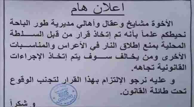 أصدرت قيادة السلطة المحلية بمديرية طورالباحة م/لحج قراراً أمنياً جديداً تمثل بمنع إطلاق الأعيرة النارية في حفلات الزفاف وغيرها من المناسبات الإحتفالية.