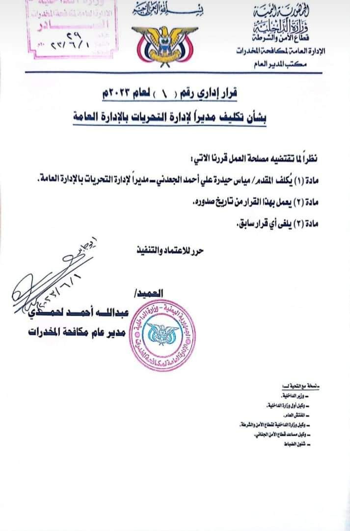 أصدر العميد عبدالله أحمد لحمدي مدير عام مكافحة المخدرات بوزارة الداخلية، قرارا قضي بتكلِّف المقدم مياس حيدرة الجعدني، مديراً لإدارة التحريات بالإدارة العامة لمكافحة المخدرات بالوزارة.