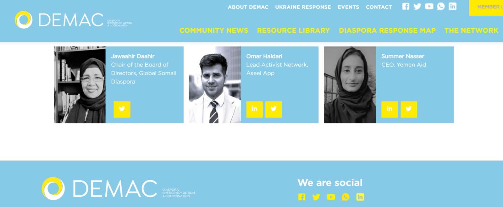 دعت المبادرة العالمية DEMAC الأستاذة سمر ناصر اليافعي رئيسة منظمة يمن أيد لتمثيل المجلس الاستشاري الاستراتيجي المرشح للفترة ما بين (2023-2025) كأول ممثل عن اليمن في مبادرة "العمل والتنسيق في حالات الطوارئ للشتات" (DEMAC) في الدنمارك، المدعومة من وزارة الشؤون الخارجية الدنماركية، والوكالة الأمريكية للتنمية الدولية، والمجلس الدنماركي للاجئين.