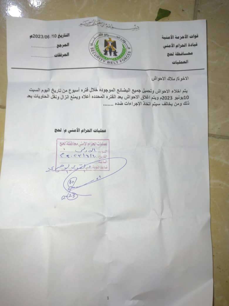 أصدرت قيادة الحزام الأمني في محافظة لحج قرارا يقضي باخلاء جميع الاحواش من بضائع التجار.