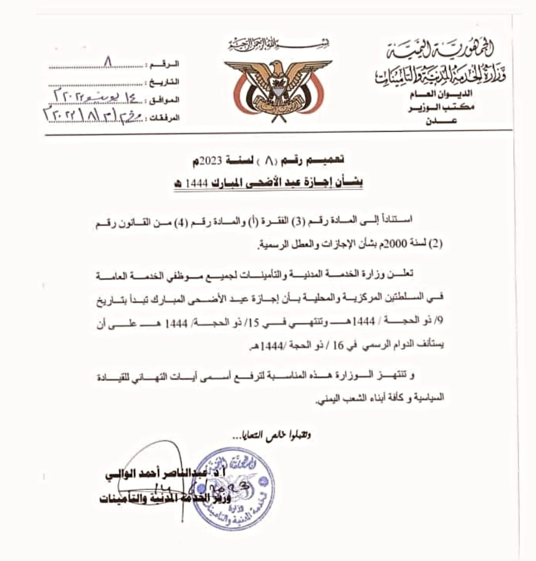 اصدرت وزارة الخدمة المدنية والتأمينات - عـدن رقم ( ٨ ) لسنة ٢٠٢٣م تعميما بشأن إجازة عيد الاضحى المبارك ١٤٤٤ه