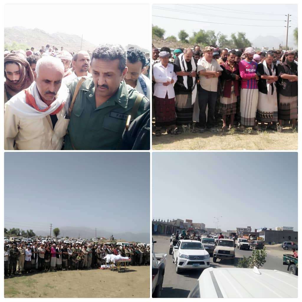 بحضور رسمي وشعبي وموكب جنائزي مهيب محافظة الضالع تودع ثلاثه من الشهداء الابطال، وهم الشهيد النقيب حسين علي عبده الشوكي، والشهيد مساعد 2 محمد محمد الشوكي، والشهيد مساعد 2 وديع محمد الجسري من ابطال اللواء 30 مدرع الذين استشهدوا في قطاع حبيل العبدي بالفاخر اثناء تصديهم لميليشيات الحوثي الارهابية.