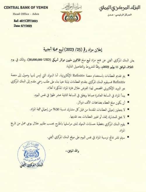 يعلن البنك المركزي اليمني عن فتح مزاد لبيع مبلغ ثلاثون مليون دولار أمريكي (30,000,000 USD)، وذلك في يوم الثلاثاء الموافق 11 يوليو 2023م، وفقًا للشروط والتفاصيل التالية: