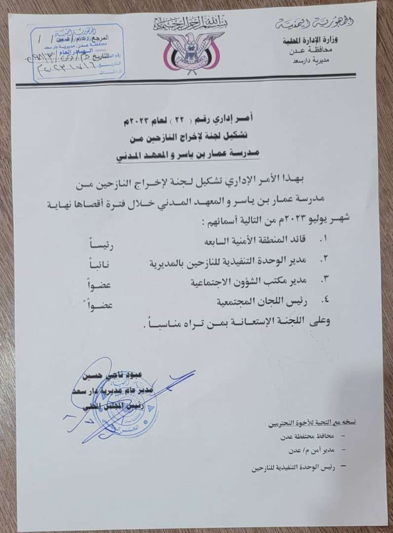 وجه مدير عام مديرية دارسعد بالعاصمة عدن الاستاذ عبود ناجي حسين بتشكيل إخلاء لإخراج النازحين من مدرسة عمار بن ياسر والمعهد المدني (الزراعي السعودي) ، الحكومية الذي تم اقتحامها منذو سنوات عدة.