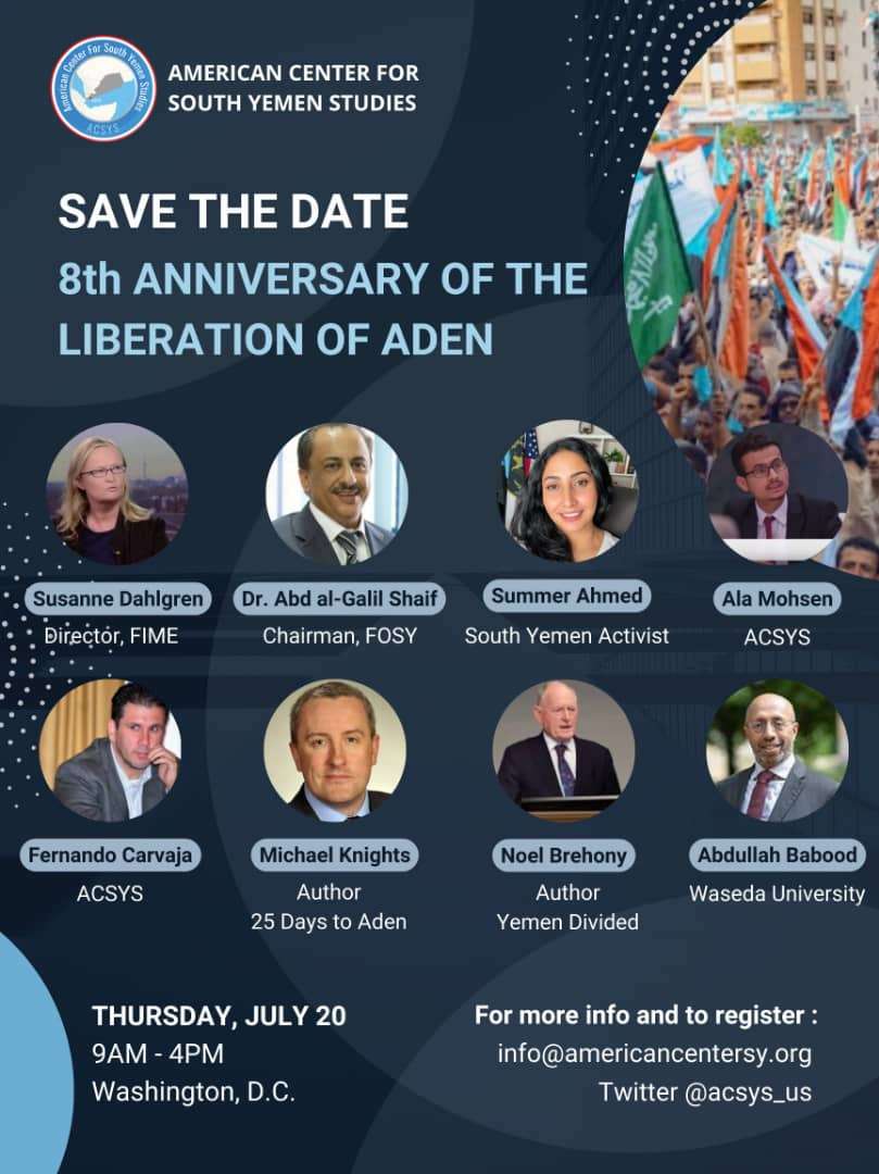 اعلن المركز الامريكي لدراسات جنوب اليمن ACSYS عن إقامة مؤتمر هام بمناسبة الذكرى الثامنة لتحرير العاصمة عدن من المليشيات الحوثية.
