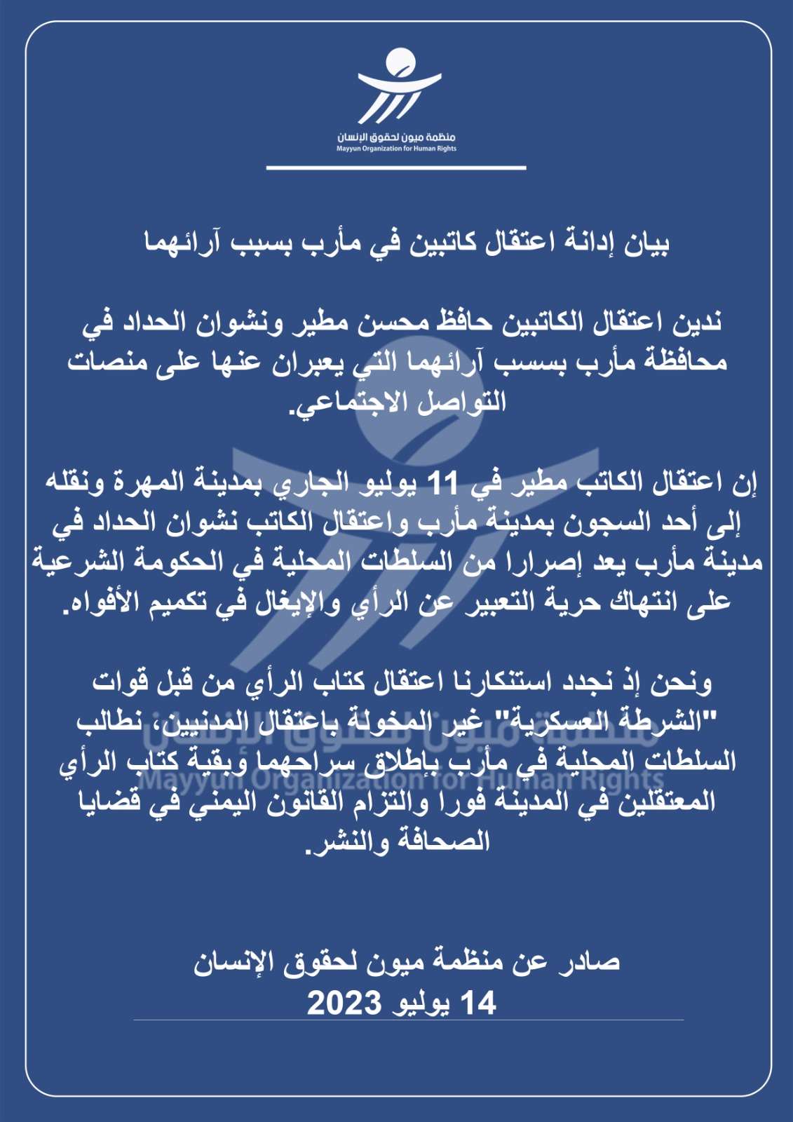 وجددت المنظمة استنكارها اعتقال كتاب الرأي من قبل قوات "الشرطة العسكرية" غير المخولة باعتقال المدنيين، مطالبة السلطات المحلية في مأرب بإطلاق سراحهما وبقية كتاب الرأي المعتقلين في المدينة فورا والتزام القانون اليمني في قضايا الصحافة والنشر.