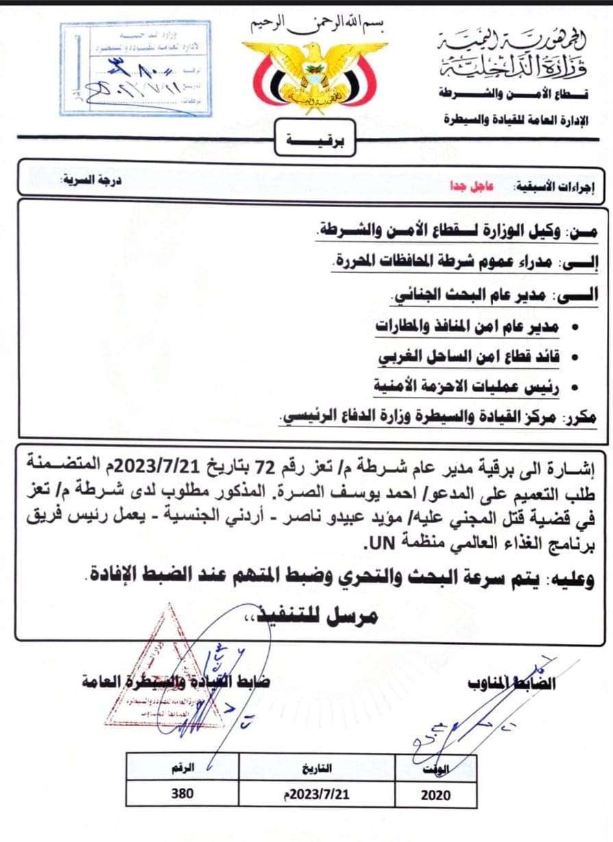 وجاء في التعميم، إن المدعو، أحمد يوسف الصرة، مطلوب لدى شرطة محافظة تعز، في قضية قتل المجني عليه ، مؤيد عبيدو ناصر حميدي – أردني الجنسية – يعمل رئيسا لفريق برنامج الغذاء العالمي التابع للأمم المتحدة.