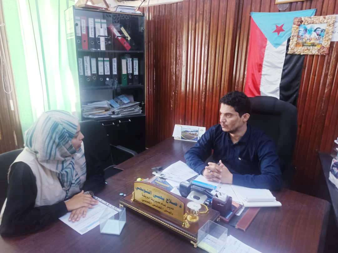 جاء ذلك خلال استقباله بمكتبه اليوم " الأحد "، ممثلة منظمة ( يمن أيد ) م. الين جمال، ومناقشة تدخلات المنظمة القادمة بقطاعي المياه والصرف الصحي في المديرية ضمن " مشروع تعزيز المرونة المؤسسية والإقتصادية في اليمن ".
