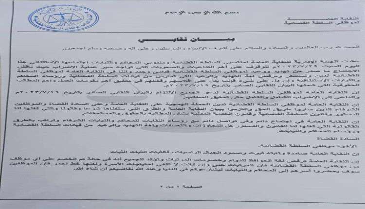 وقالت النقابة العامة في بيانها أن الإضراب حق مشروع كفله القانون ودعت جميع موظفي السلطة القضائية بالالتزام بالإضراب الشامل والكامل حتى تحقيق المطالب وحذرت أنه في حال القيام باتخاذ أي إجراء تعسفي ضد أي موظف فإنها سوف تقوم بالخطوات التصعيدية التي كفلها القانون.