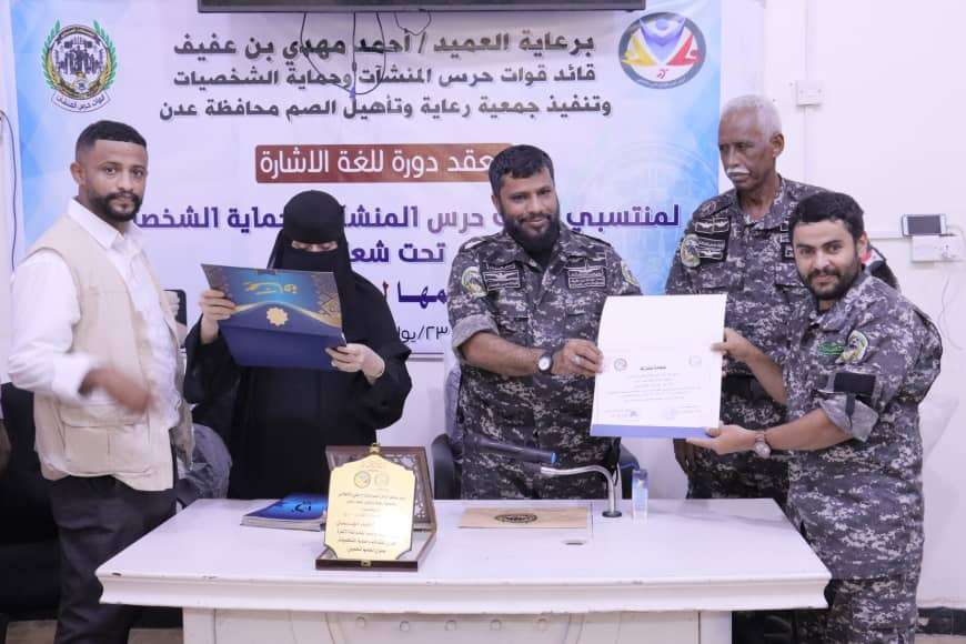اختتمت ،يوم الاثنين، دورة تعليم لغة الإشارة التي أقيمت في معسكر قوات حرس المنشآت الحكومية برعاية العميد أحمد مهدي بن عفيف قائد القوات وتنفيذ جمعية رعاية وتأهيل الصم في عدن.
