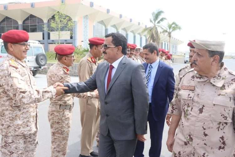 وكان في استقباله رئيس هيئة العمليات المشتركة اللواء الركن صالح علي حسن ورئيس هيئة الاستخبارات اللواء الركن احمد محسن اليافعي ورئيس هيئة القوى البشرية اللواء الركن احمد المرزوقي ورئيس هيئة التدريب والتأهيل اللواء الركن محمد الردفاني وقائد المنطقة العسكرية الرابعة اللواء الركن فضل حسن وقائد الشرطة العسكرية اللواء الركن محمد صالح الشاعري ونائب رئيس هيئة اللوجستي اللواء الركن علي الفضلي ونائب رئيس هيئة العمليات العميد الركن ناجي عباس واركان حرب المنطقة الرابعة اللواء الركن احمد البصر ومدير دائرة شؤون الافراد العميد الركن الخضر مزمبر ومدير دائرة العلاقات العميد الركن علي الثور ومدير دائرة الاشغال العسكرية العميد الركن فضل غرامة ومدير دائرة الاستخبارات ناصر عبدالرب ومدير المالية عدن العميد الركن عبدالله عبدربه وعدد من القادة والضباط