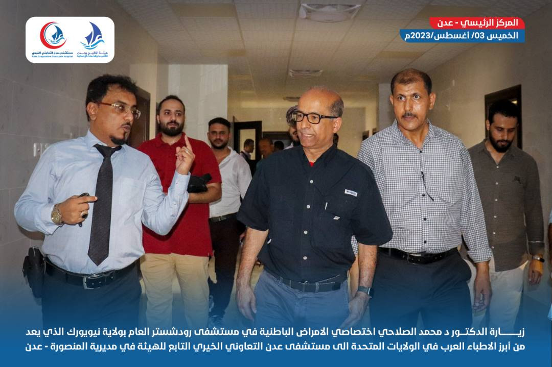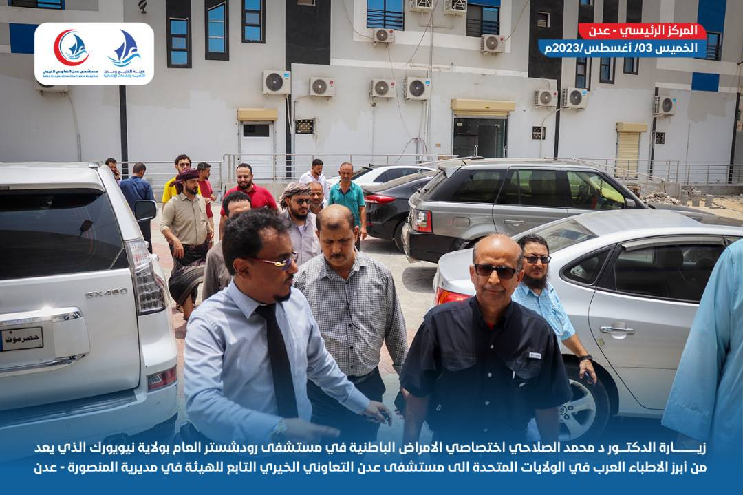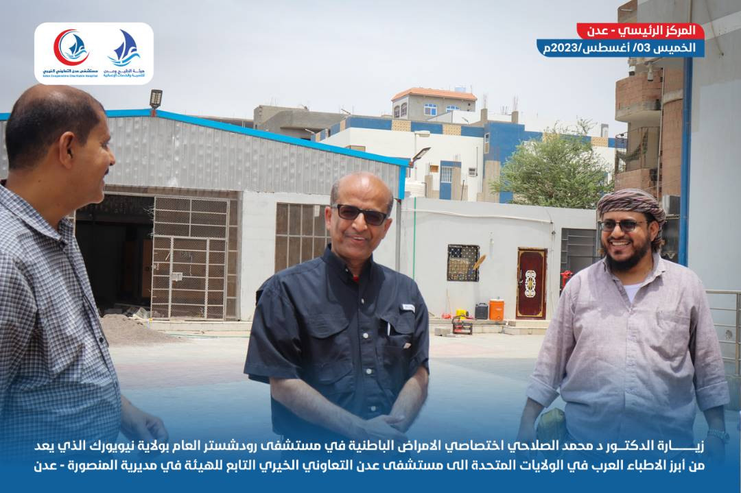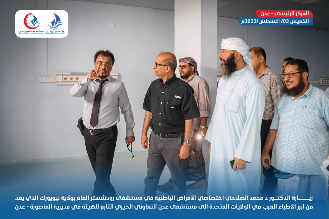 قام الدكتور محمد الصلاحي اختصاصي الامراض الباطنية في مستشفى "رودشستر" العام بولاية نيويورك الأمريكية بزيارة لمستشفى عدن التعاوني الخيري في مديرية المنصورة حيث اطّلع على مستوى إنجاز المشروع التابع لهيئة الخليج وعدن للتنمية والخدمات الانسانية.