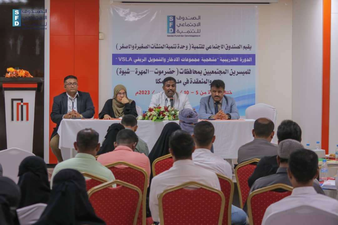 دشّن الصندوق الاجتماعي للتنمية فرع المكلا (وحدة تنمية المنشآت الصغيرة والأصغر)صباح اليوم أعمال الورشة التدريبية الخاصة بمنهجية مجموعات الإدخار والتمويل الريفي VSLA بحضور الأستاذ فهمي عوض باضاوي وكيل محافظة حضرموت المساعد لشؤون الشباب،رفقة الدكتور عوض سالم لقصم مدير الصندوق الاجتماعي للتنمية فرع المكلا،والتي تستهدف عدد (90) من الميسريين المجتمعيين، والمنعقدة أعمالها في مؤسسة عبدالاله بن محفوظ، خلال الفترة من 5/أغسطس حتى 10/أغسطس من العام الجاري.