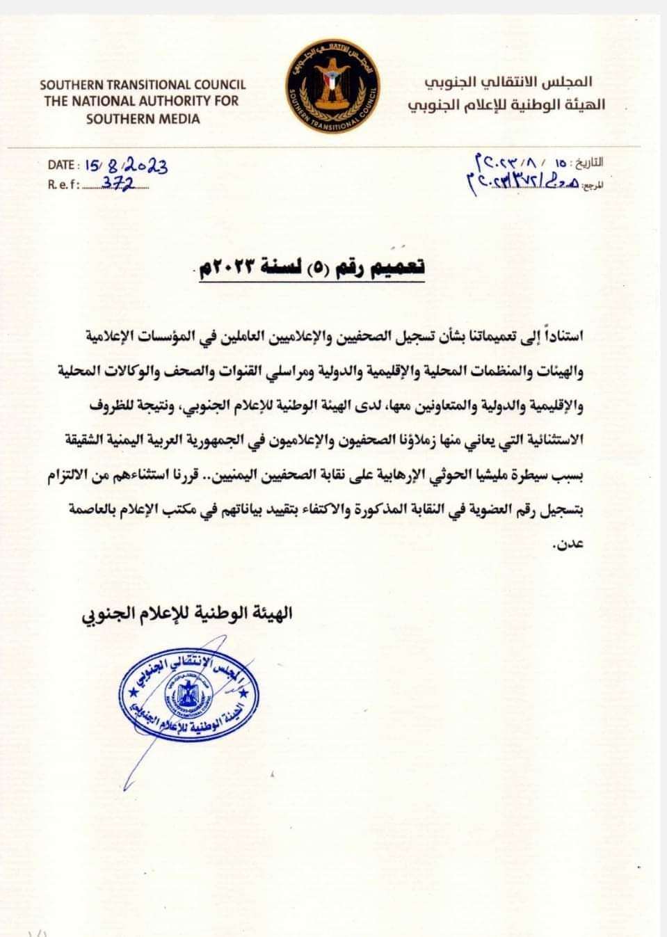 استنادا إلى تعميماتنا السابقة بشأن تسجيل الصحفيين والاعلاميين العاملين في المؤسسات الإعلامية والهيئات والمنظمات المحلية والإقليمية والدولية ومراسلي القنوات والصحف والوكالات المحلية والإقليمية والدولية والمتعاونين معها، لدى الهيئة الوطنية للإعلام الجنوبي ، ونتيجة للظروف الاستثنائية التي يعاني منها زملاؤنا الصحفيون والإعلاميون في الجمهورية العربية اليمنية الشقيقة بسبب سيطرة مليشيا الحوثي الإرهابية على نقابة الصحفيين اليمنيين.. قررنا استثناءهم من الالتزام بتسجيل رقم العضوية في النقابة المذكورة والاكتفاء بتقييد بياناتهم في مكتب الإعلام بالعاصمة عدن.