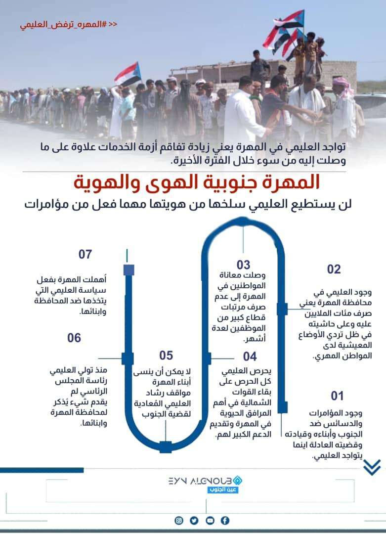 وجدد أبناء المهرة تأكيدهم على مطالب أبناء المهرة في سرعة تحرير محافظتهم من الاحتلال اليمني لا سيما بعد تزايد ممارسات تلك القوات المهجية ضد أبناء المهرة، والمطالبة بإحلال قوات مهرية جنوبية من أبناء المهرة، وتحسين الخدمات وإيقاف الإيرادات وتسخيرها لخدمة المحافظة، إلى جانب التأكيد على أن محافظة المهرة جنوبية وأن أبناءها مع مشروع استعادة دولة الجنوب.