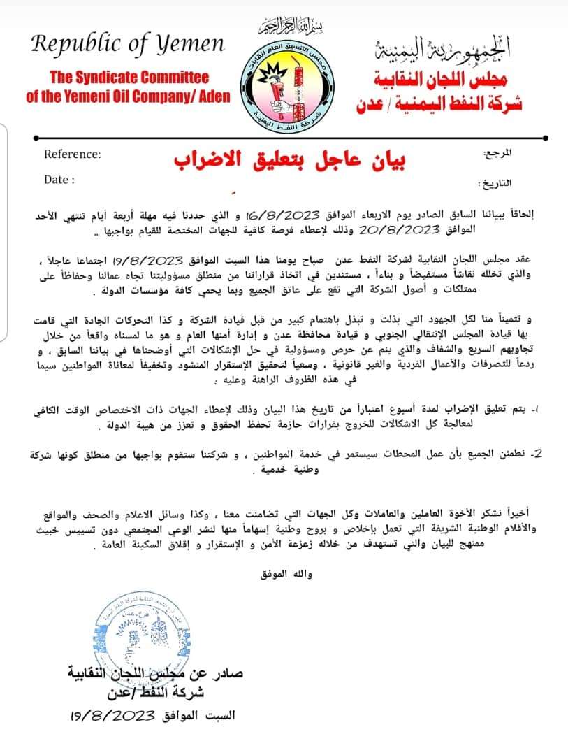 عقد مجلس اللجان النقابية لشركة النفط عدن صباح يومنا هذا السبت الموافق 19/8/2023 اجتماعا عاجلاً ، والذي تخلله نقاشاً مستفيضاً وبناءاً ، مستندين في اتخاذ قراراتنا من منطلق مسؤوليتنا تجاه عمالنا وحفاظاً على ممتلكات وأصول الشركة التي تقع على عاتق الجميع وبما يحمي كافة مؤسسات الدولة.