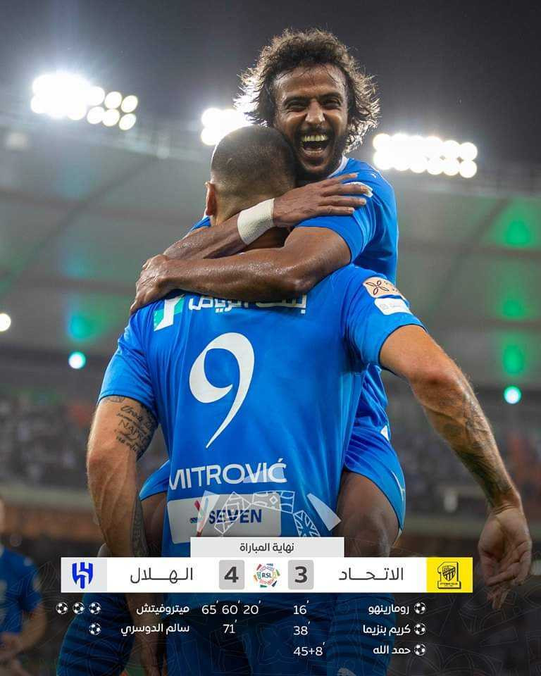 وفي الشوط الثاني، تمكن الهلال من تقليص الفارق عن طريق الكسندر ميتروفيتش في الدقيقة 60، ثم سجل نفس اللاعب الهدف الثالث له (هاتريك) ولفريقه في الدقيقة 65 من ركلة جزاء، قبل أن يسجل سالم الدوسري الهدف الرابع للهلال في الدقيقة 71.